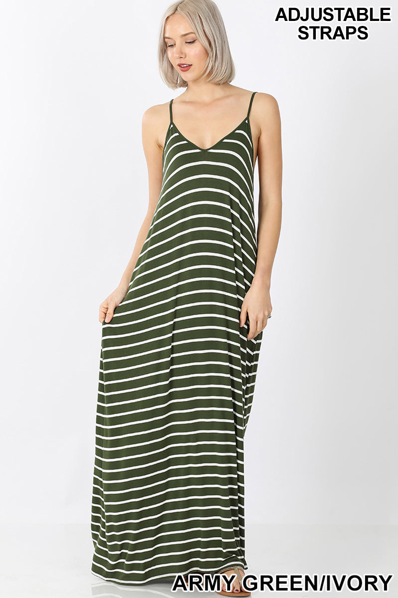 Description: STRIPE CAMI MAXI DRESS WITH POCKET ARMY GREEN